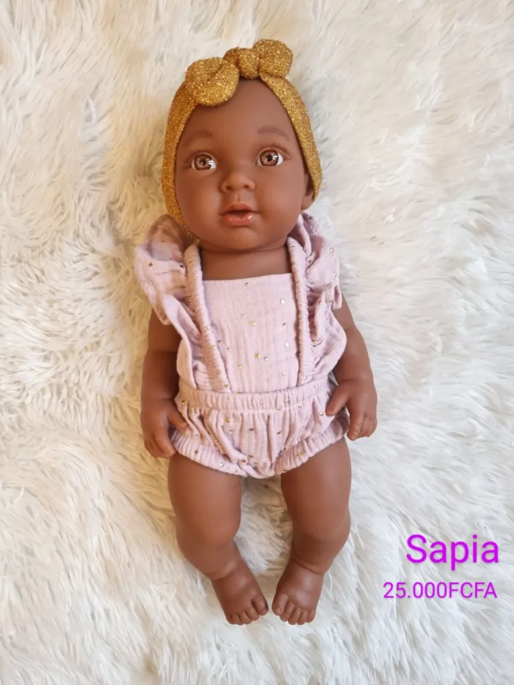 Elle est une magnifique bébé fille sans cheveux. Elle a les yeux fixes et mesure 32cm. Elle est recommandée pour les enfants à partir de 10 mois. Vêtements lavables Utiliser un chiffon humide pour nettoyer le visage ou le corps. N'appliquez pas de fer à lisser sur les cheveux. Utiliser un peigne afro ou utiliser les mains pour la coiffure. Vous pouvez laver les cheveux ( bien que non recommandé). Nos poupées sont fabriquées en Espagne. Les matériaux utilisés pour la réalisation des poupées sont de très haute qualité et garanti sans phtalates avec un parfum subtile à la vanille. -Corps articulé -Anatomiquement correct -Taille : 32cm -Pois : 500h -Age : 3ans et plus